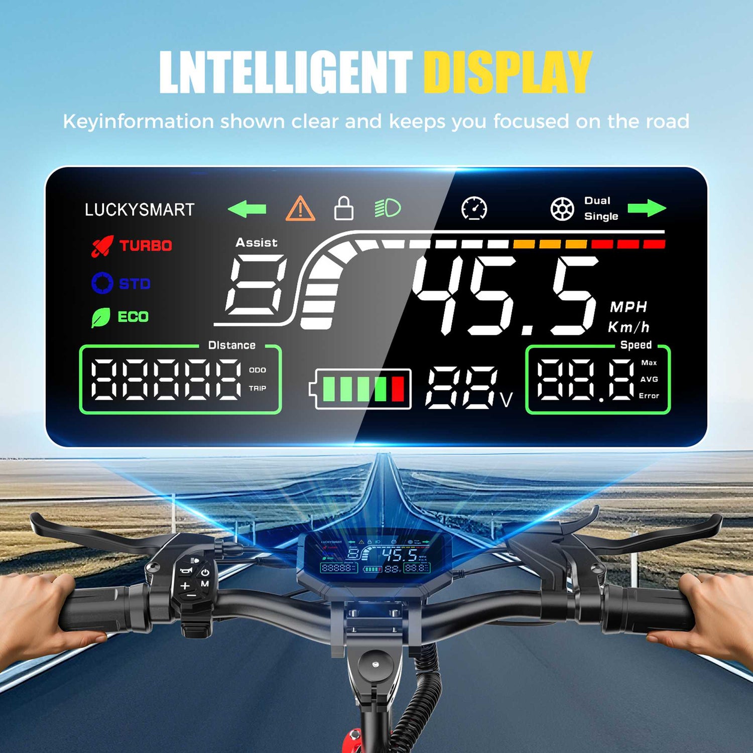 Stay in the know with the smart LCD display. Centered on the handlebars, it shows your speed, battery life, trip distance, and riding mode at a glance, so you can focus on the road ahead.